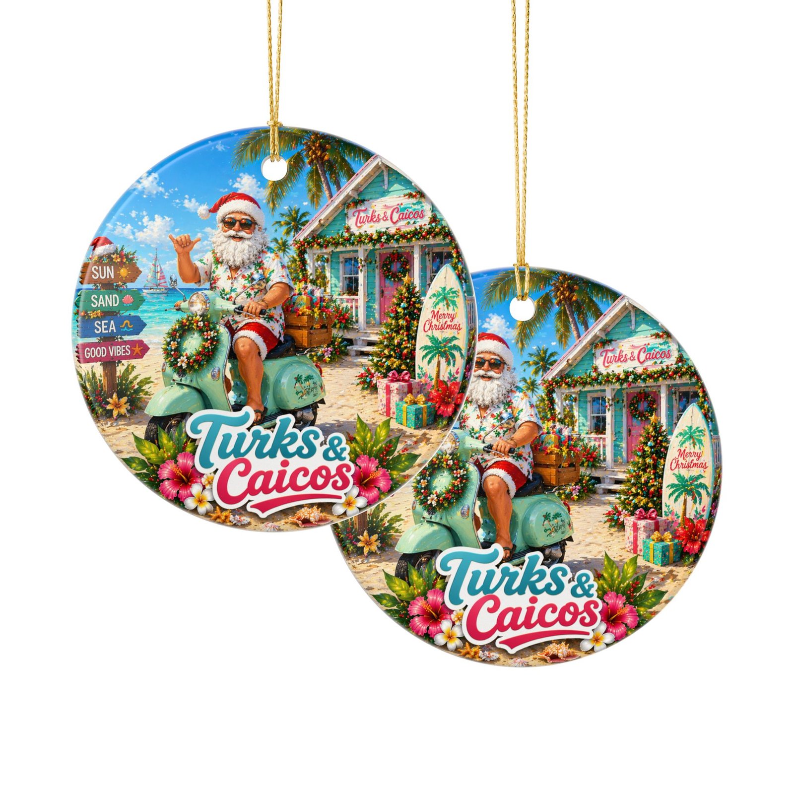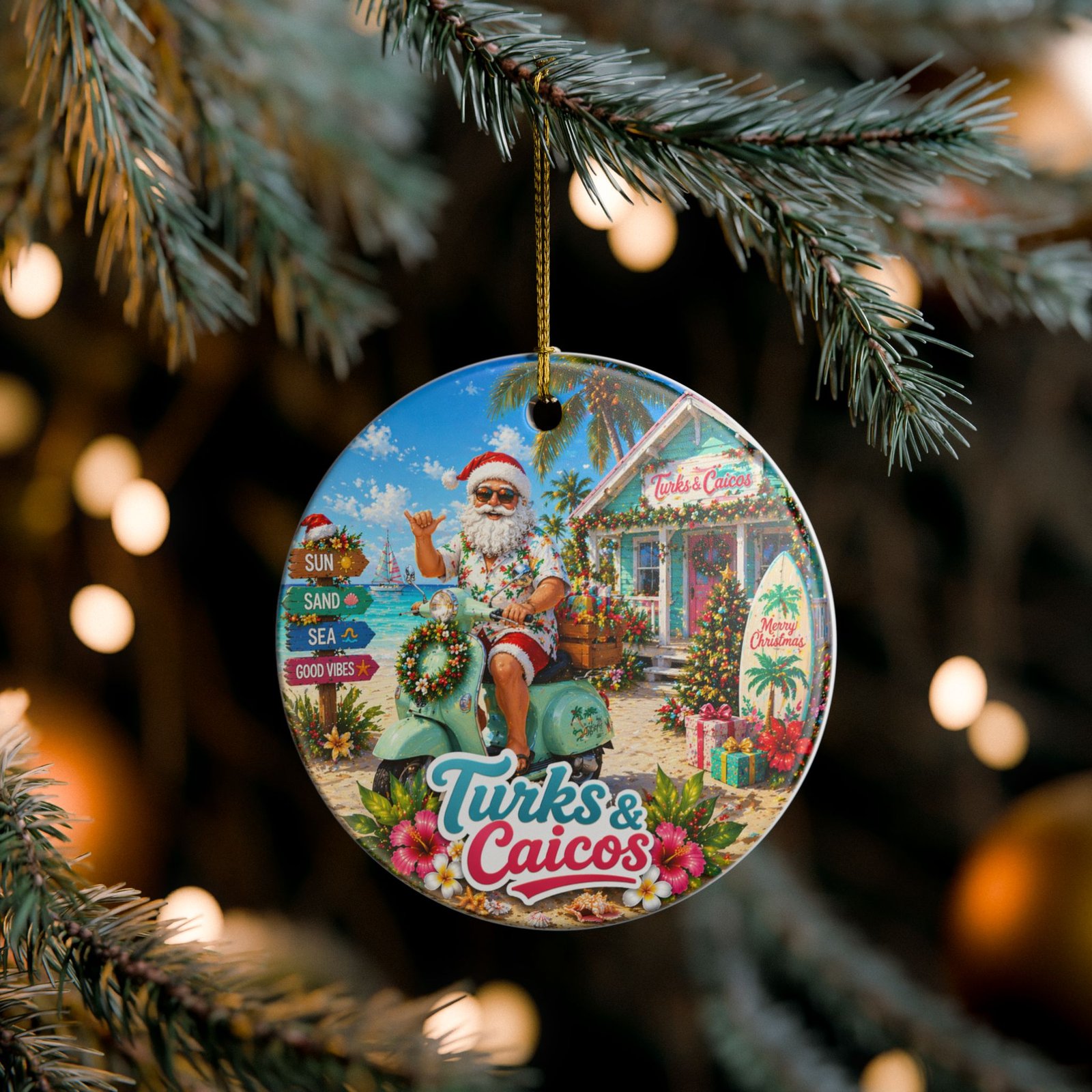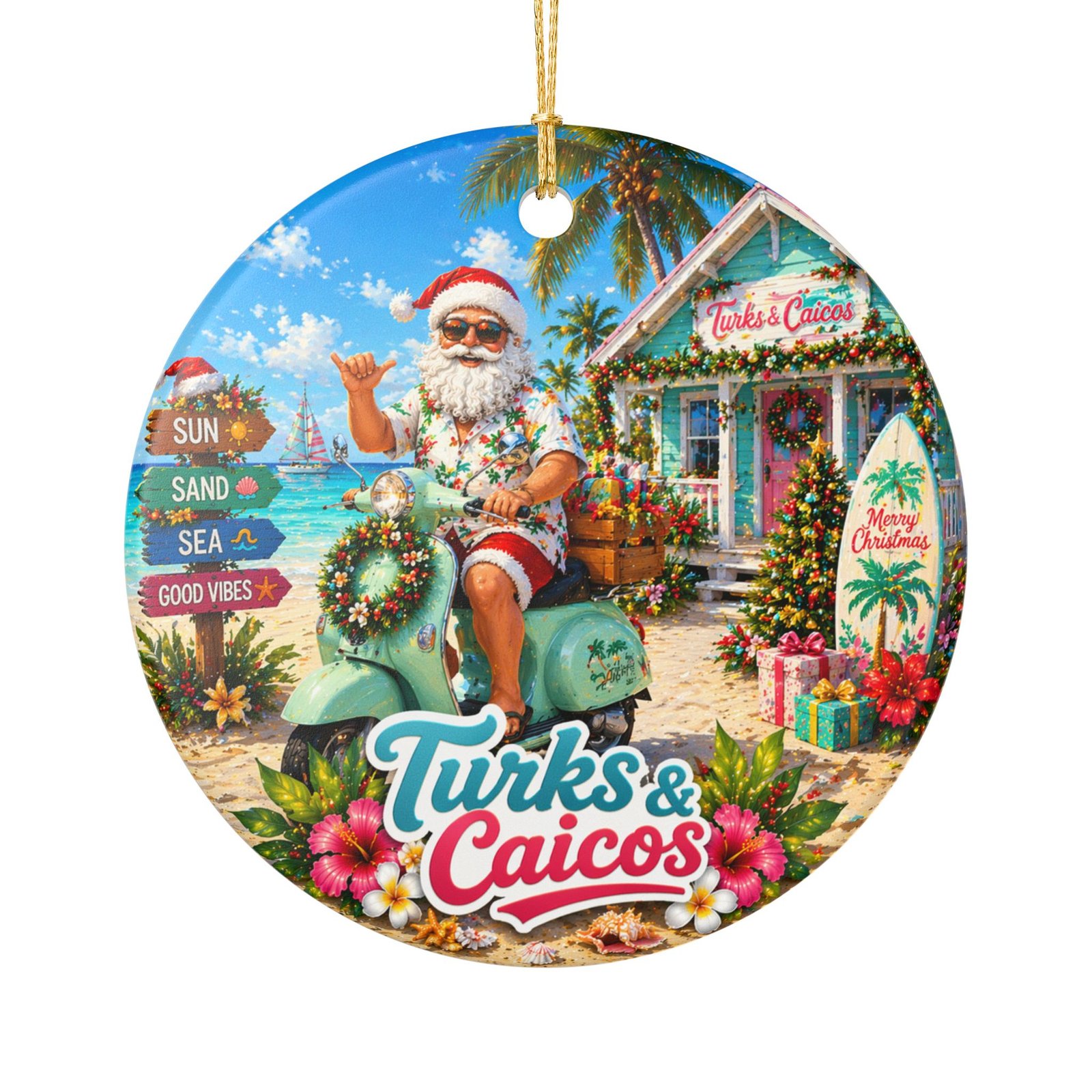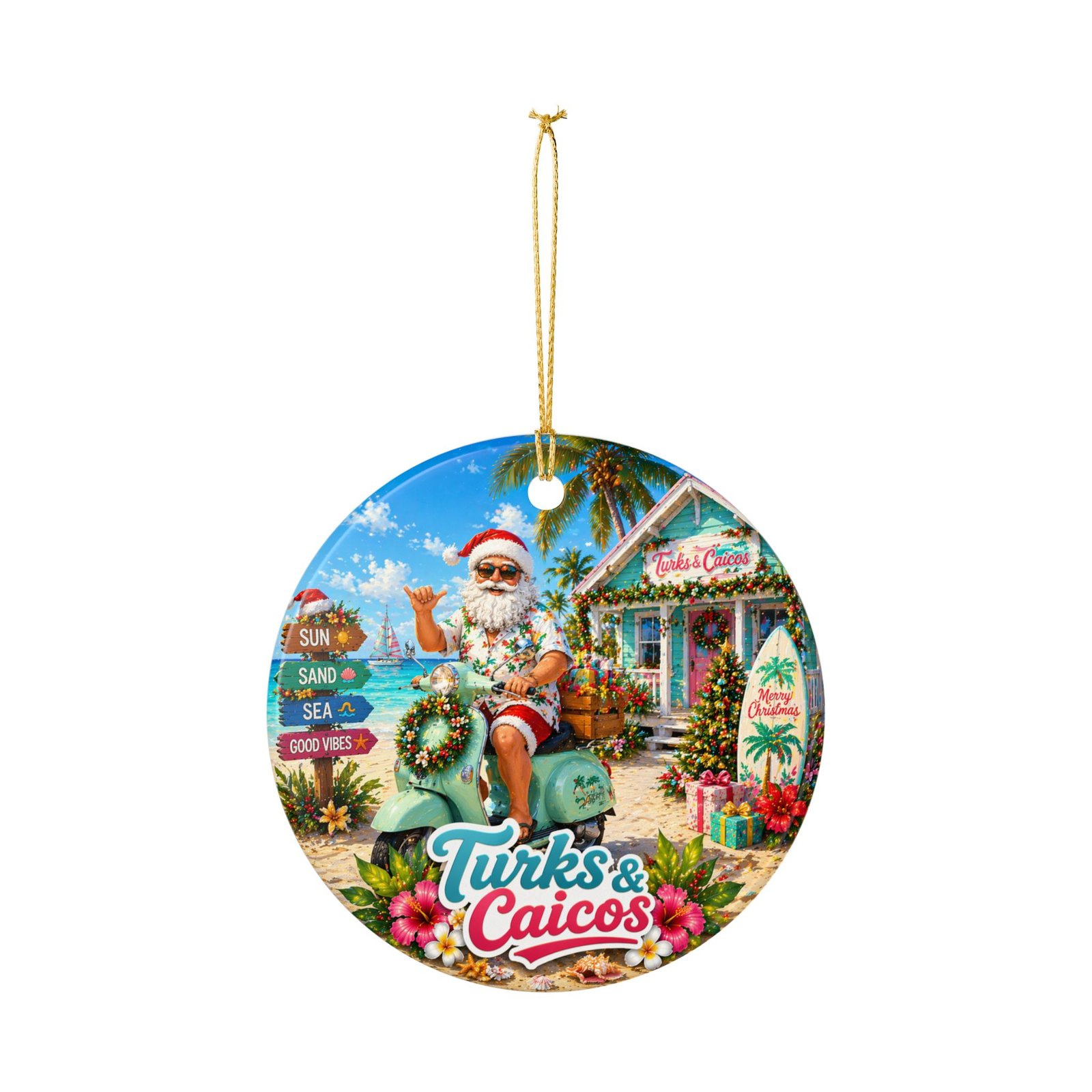 Bring a sunlit, seaside Christmas to your tree with this ceramic ornament. A jolly Santa lifts a tropical cocktail while a sack of brightly wrapped gifts and island motifs—palm fronds, starfish, and a distant sailboat—frame the scene. Matte printing keeps the artwork rich and tactile while the glossy ceramic edges catch the lights of your tree. The included gold string adds a warm, festive shimmer and the double-sided print lets this ornament charm from every angle. Hang it on a holiday branch, add it to a travel-themed tree, or tuck it into a gift box for someone who loves warm-weather celebrations.