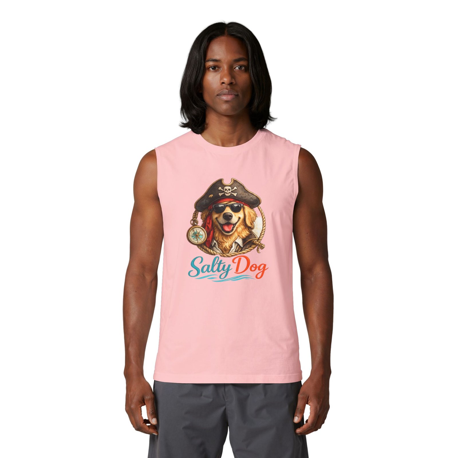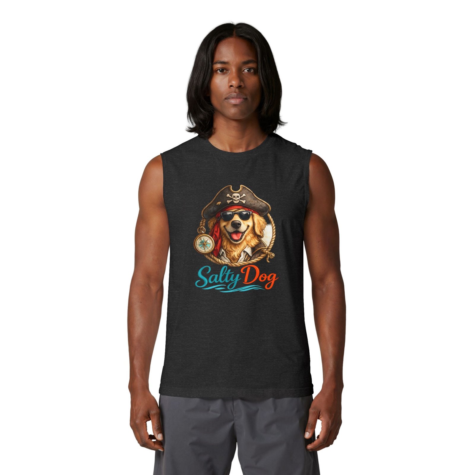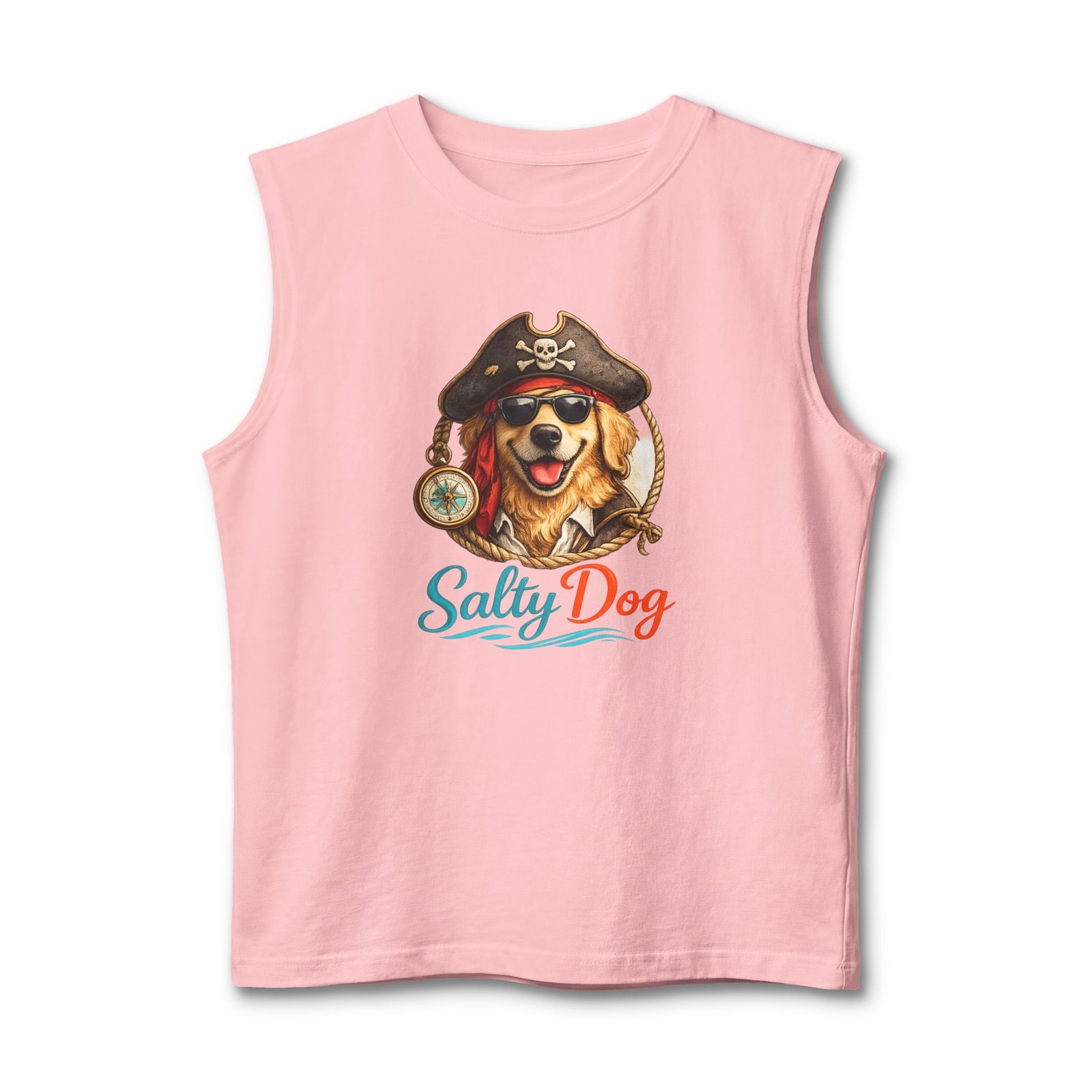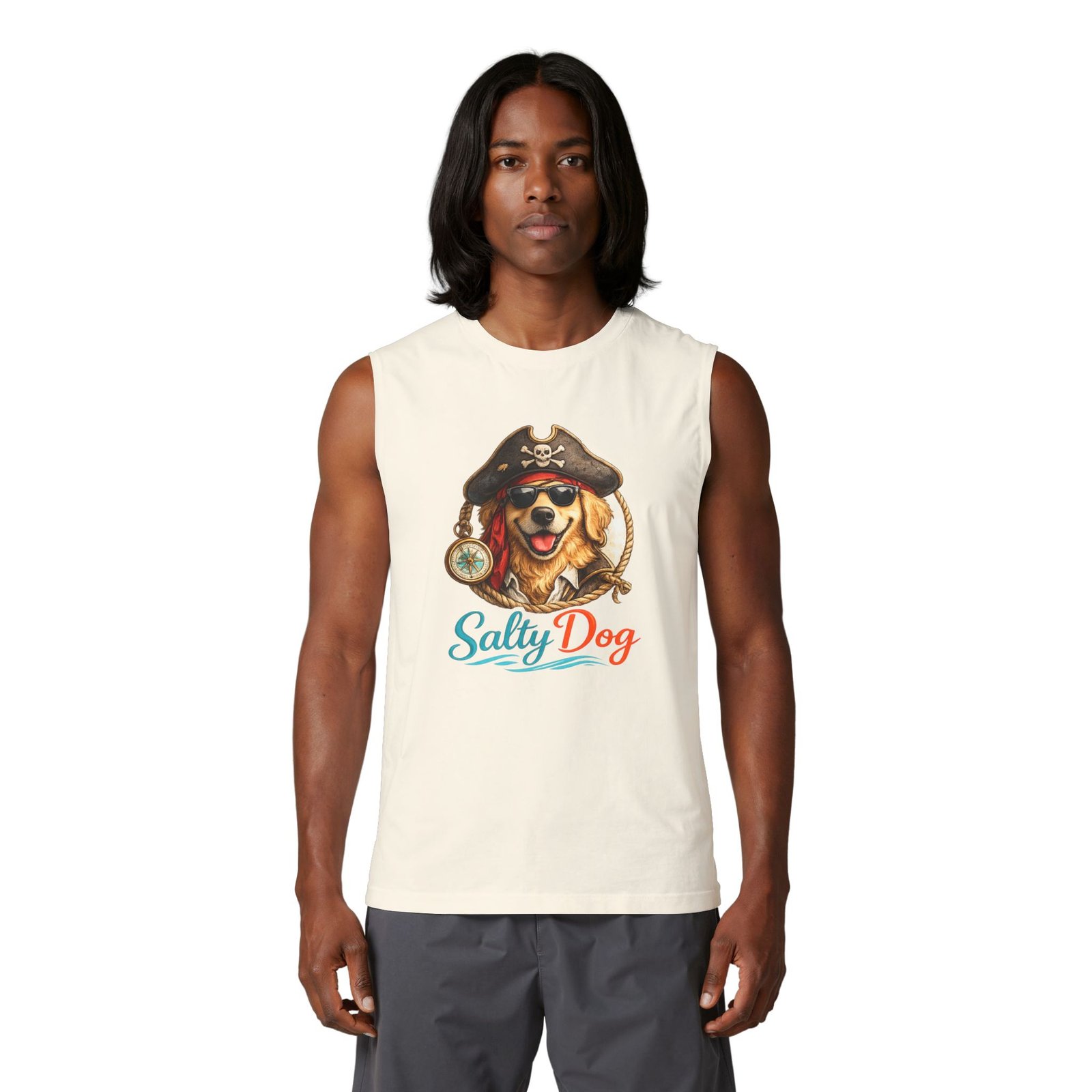 Salt air, sun on your face, and a wagging companion at your side — this muscle tank channels easy, beachside energy with a playful pirate-dog illustration and bright, ocean-tinted lettering. Lightweight and structured, it sits cleanly at the shoulders and drapes comfortably over the chest, so you can move from morning surf walks to bonfire nights without fuss. The design feels like a salty laugh shared with friends on a summer pier; it’s for people who love dogs, coastal weekends, and clothing that looks lived-in but still sharp. Throw it on with board shorts or layered under an open shirt when the breeze picks up — it blends casual utility with a warm, nostalgic vibe suited to seaside gatherings and laid-back summer rituals.