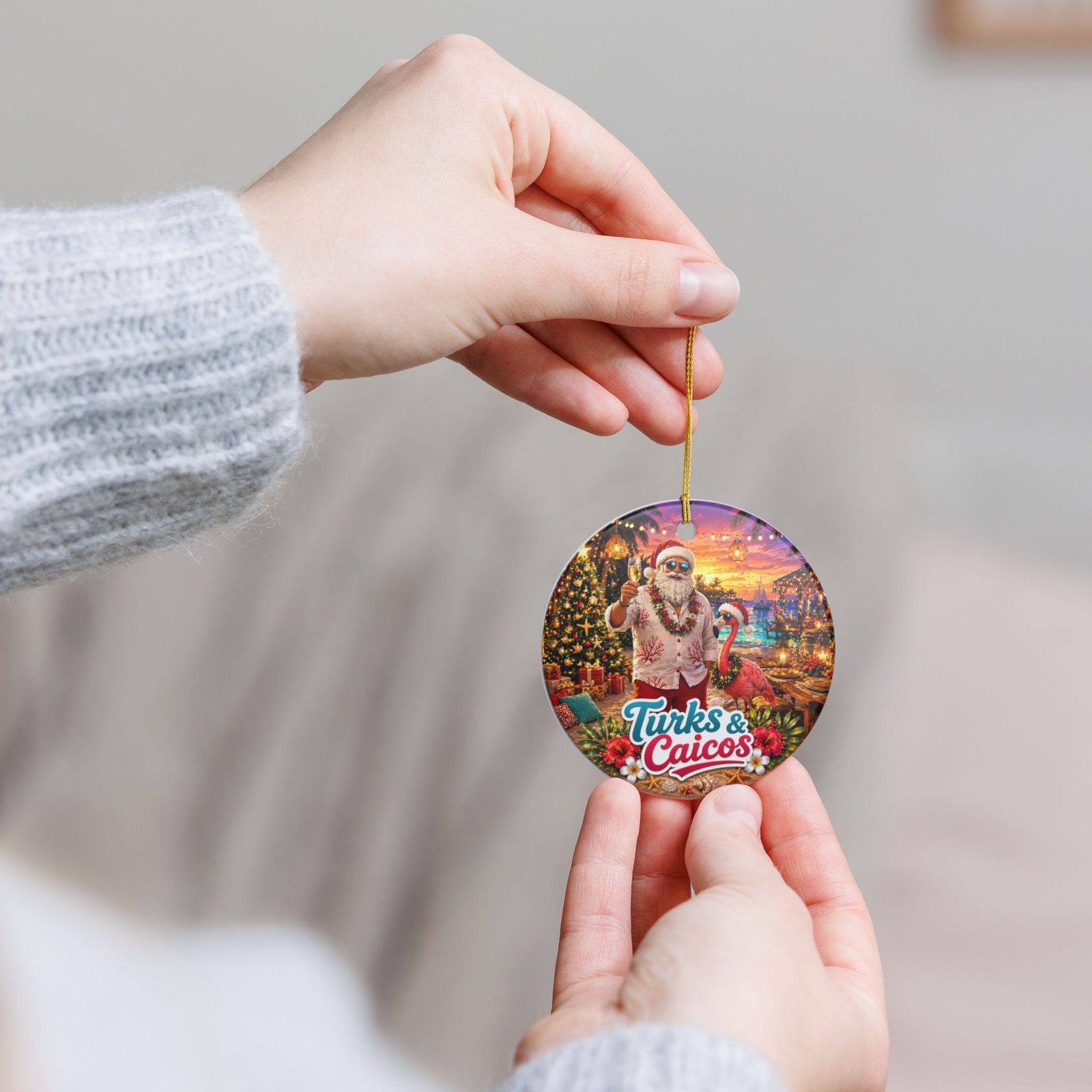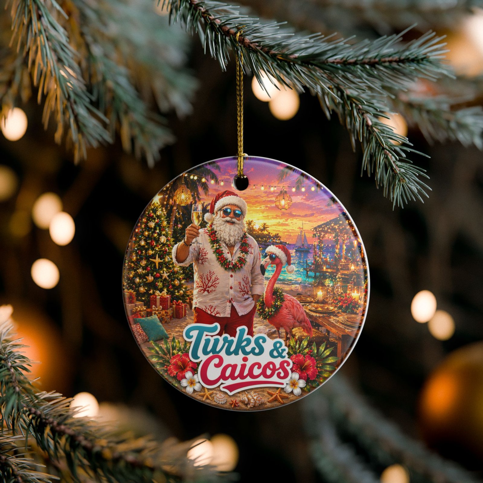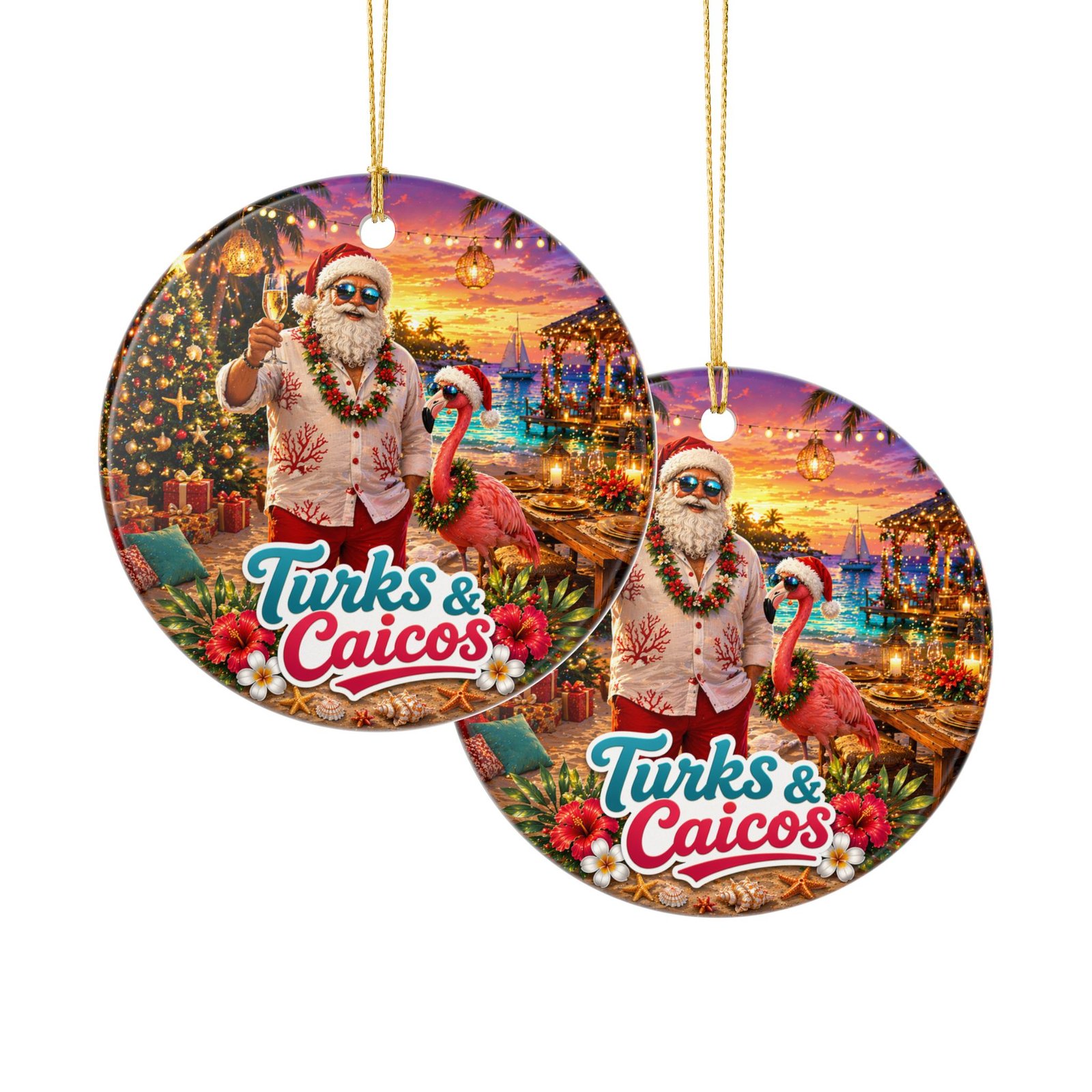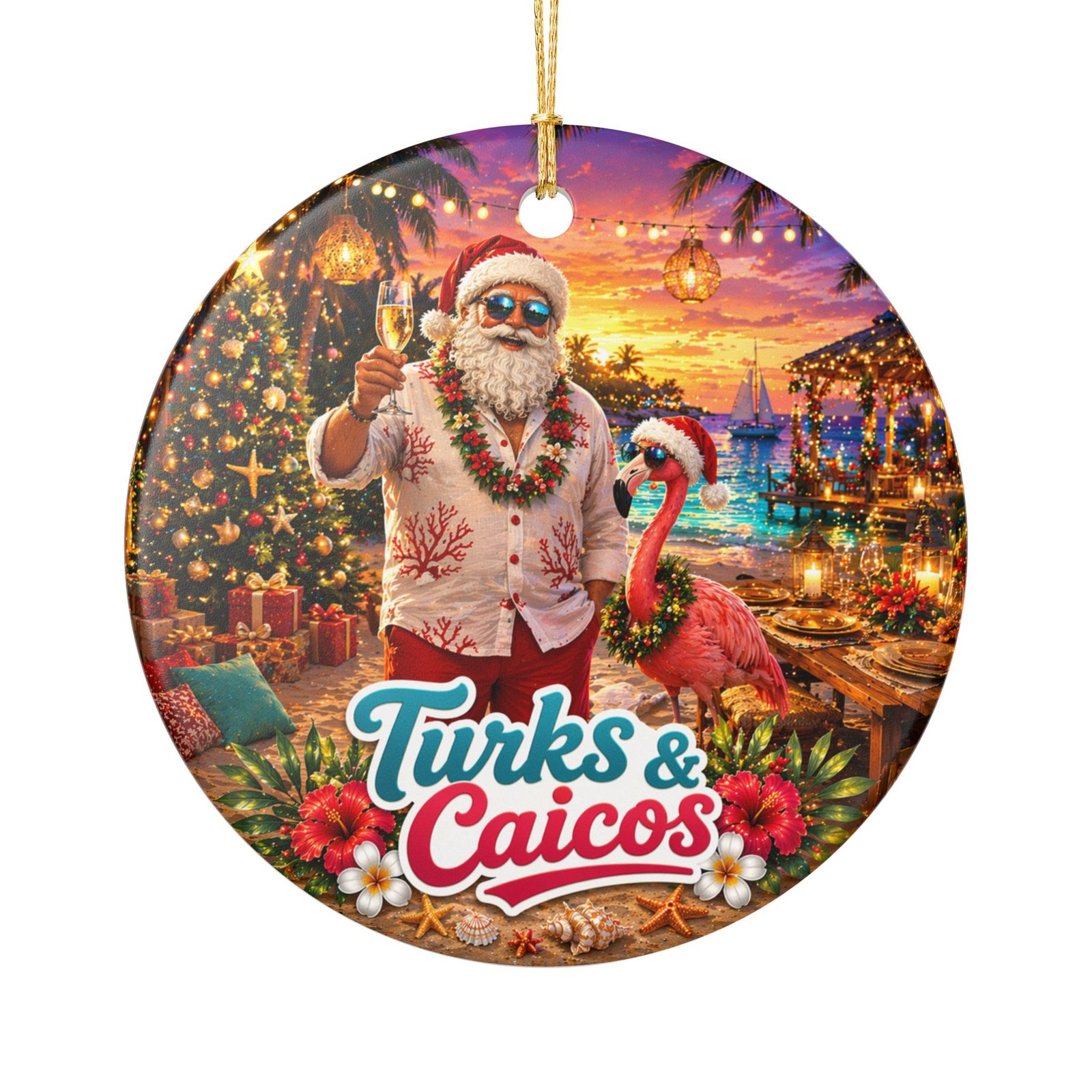 This ceramic ornament brings a sunny, seaside holiday vibe to any space. A cheerful Santa in a floral shirt raises a pineapple drink aboard a cruise ship, while the turquoise water and distant islands read “Turks & Caicos.” The round, double-sided print keeps the scene vivid from every angle, and the included gold string adds a warm, festive shimmer. Hang it from a tree branch, a mantle hook, or in a window to summon memories of tropical escapes and easy, breezy celebrations.